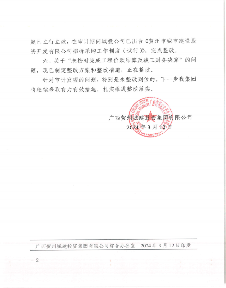 上一篇:廣西賀州城建投資集團(tuán)有限公司2022年度財務(wù)收支情況審計整改情況公告